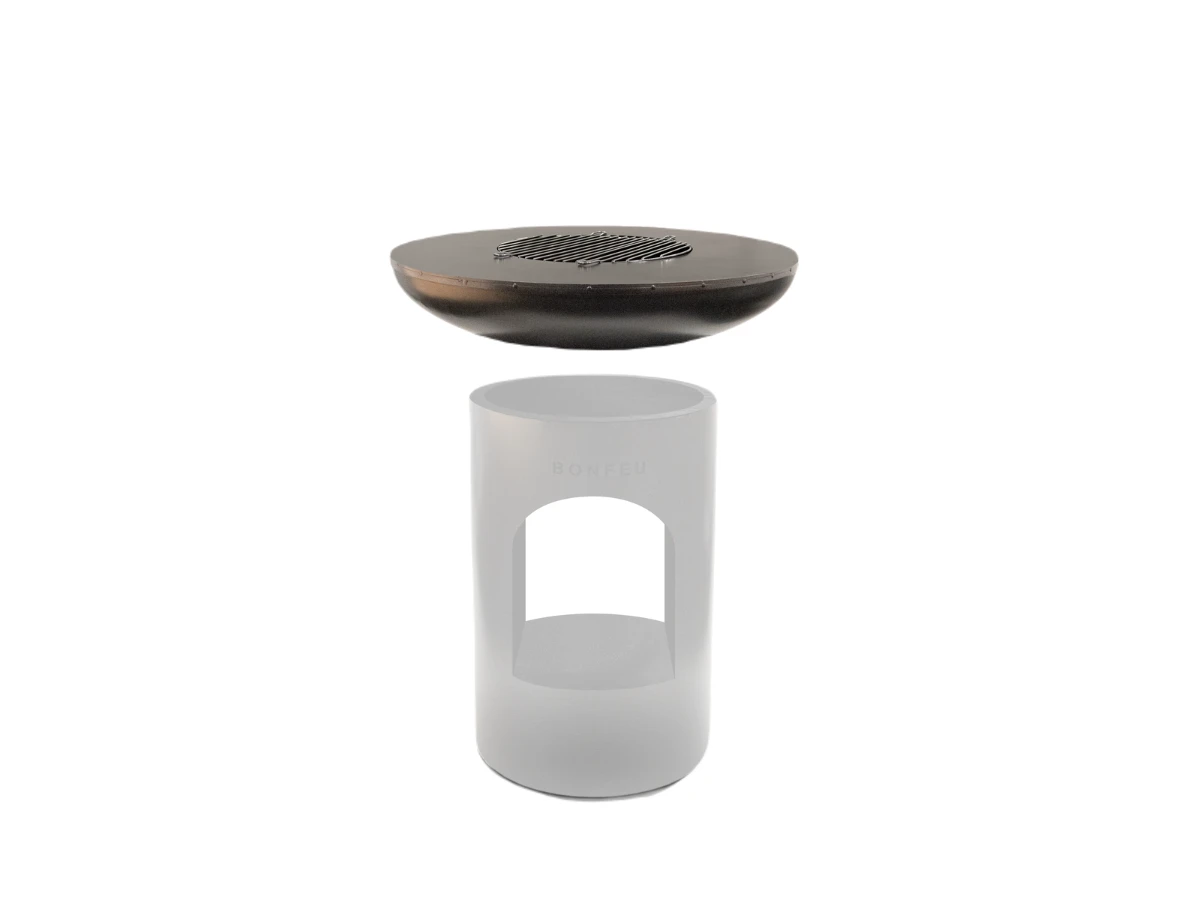 Die Feuerschale liegt auf einem breiten, massiven Sockel mit gelasertem BonFeu-Logo – das Alleinstellungsmerkmal der BonFeu-Produkte.