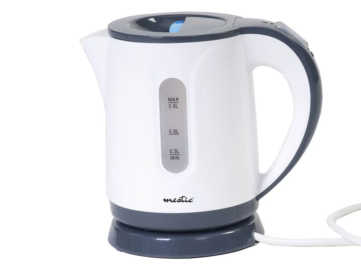 Der Mestic Wasserkocher 0,8L MWC-100 hat ein modernes Aussehen mit seinem schlanken weißen Gehäuse. Dieser Wasserkocher ist schnurlos. Durch die Anzeige-Beleuchtung in der Bodenplatte kann man sehen, ob der Wasserkocher eingeschaltet ist. Auf der Bodenplatte ist der Wasserkocher 360° drehbar und somit in jede mögliche Position zu bringen. Der Wasserkocher verfügt über eine automatische Abschaltung und Trockenlaufschutz.