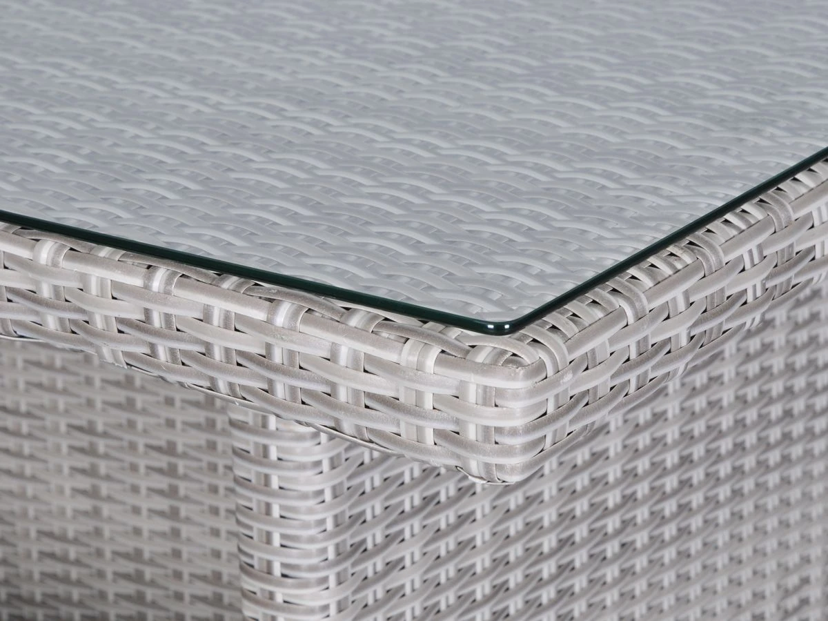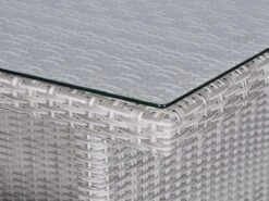 Das Set besteht aus einem geräumigen Ecksofa mit einer Größe von 210 x 260 cm, einen Esstisch mit einer Glasplatte mit einer Größe von 150 x 80 cm und zwei Hockern mit einer Größe von 46 x 36 cm. Mit einer guten Schutzhülle schützen Sie das Set und verlängern so die Lebensdauer. Wir empfehlen Ihnen, die Kissen in einer Kissenbox oder -tasche aufzubewahren.