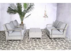 Diese moderne Lounge-Set Bradley besteht aus einer Kombination aus Aluminium und Korbwaren. Das Set wird komplett mit einem Sofa, 2 Stühlen und einem Tisch geliefert. Dank der schönen vollen grauen Kissen, ist es bequem im Garten zu genießen. Aufgrund des Materials ist die Garnitur völlig pflegeleicht.