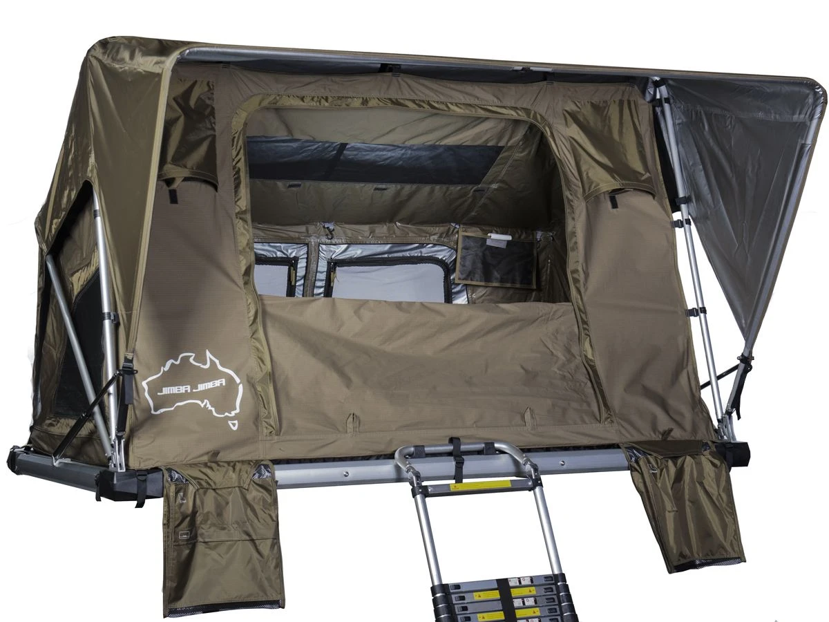 Dank der leichten Konstruktion kann das Jimba Jimba Medium auf nahezu jedem Auto mit Dachträgern montiert werden. Mit den mitgelieferten Halterungen kann das Zelt ganz einfach wie eine Dachbox montiert werden. Das Jimba Jimba ist mit einem wasserdichten Bezug ausgestattet, sodass das Zelt und die integrierte Matratze bei schlechtem Wetter trocken bleiben. Dank der integrierten Gasdruckfedern lässt sich das Jimba Jimba einfach ein- und ausklappen. Die mitgelieferte Teleskopleiter sorgt dafür, dass Sie problemlos in das Zelt gelangen.