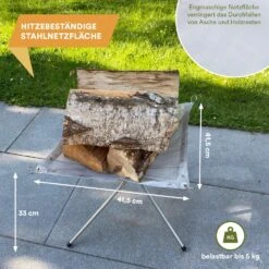 Im Handumdrehen wird das stabile Stahlrohrgestell zusammengesteckt und die hitzebeständige Stahlnetzfläche einfach mit den vier Clips sicher befestigt – ganz ohne Werkzeug. Die engmaschig gewebte Fläche verhindert, dass viel Asche oder angebrannte Holzreste auf den Boden durchfallen und hält ein Gewicht von bis zu 5 kg aus. Die vier Beine haben am unteren Ende Kunststoff-Schutzkappen, damit die Feuerschale rutschfest und sicher steht, ohne den Untergrund zu beschädigen.