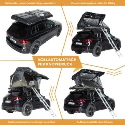 Wurde die perfekte Location für das Campingabenteuer gefunden, ist der Aufbau des Zeltes denkbar unkompliziert. Zuerst werden die Verriegelungen an der Hartschale und an der Leiter einfach gelöst. Dank Fernbedienung entfaltet sich das Dachzelt per Knopfdruck nun von ganz allein in kürzester Zeit – vollautomatisch, innerhalb nur einer Minute. Nur noch die Leiter ausklappen und die Hartschale leicht nach oben schieben und schon kann der Urlaub beginnen!