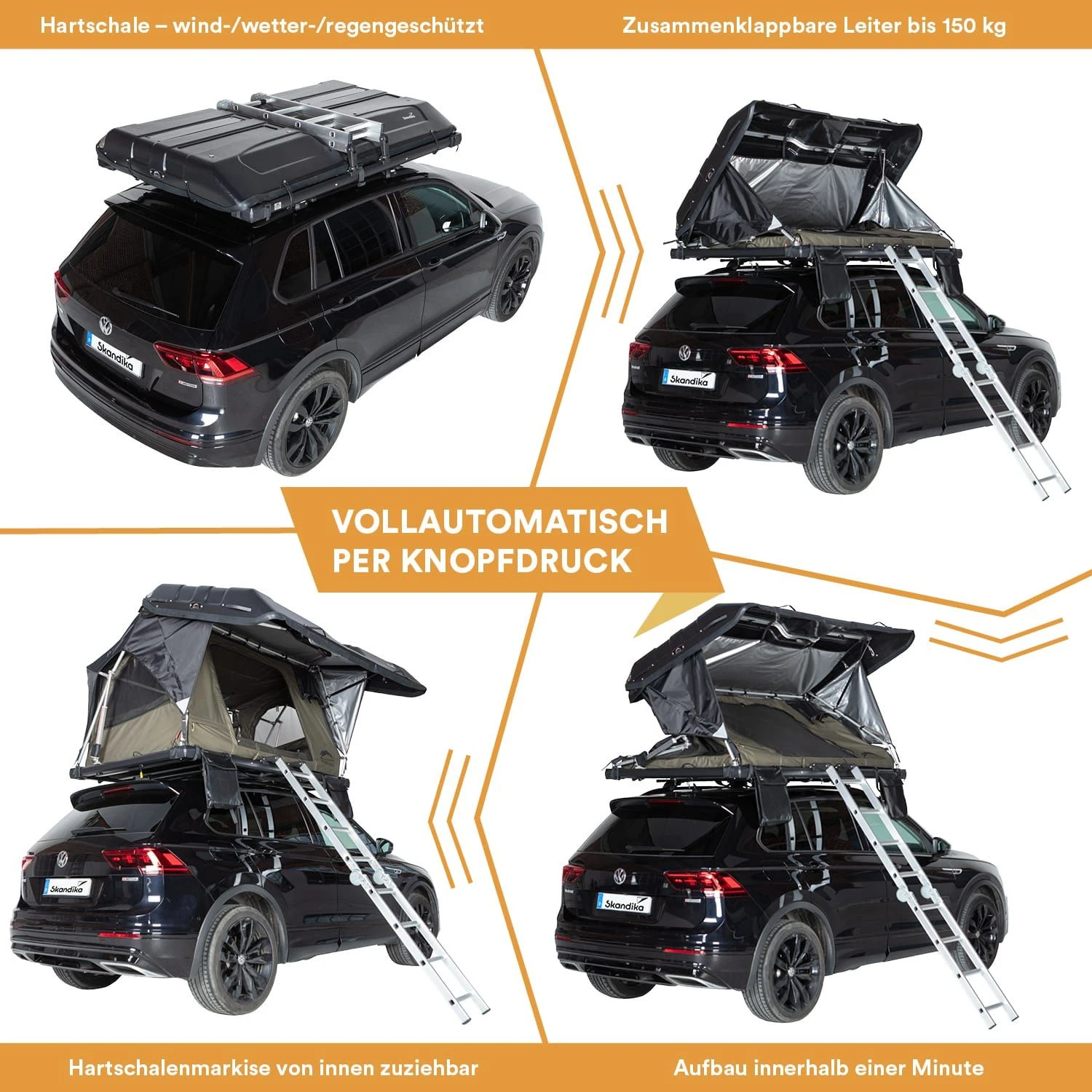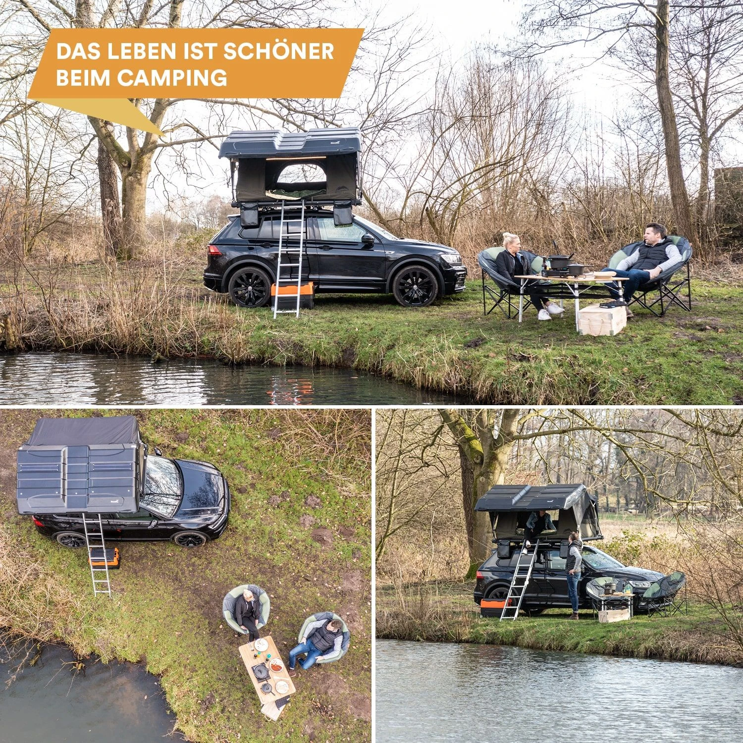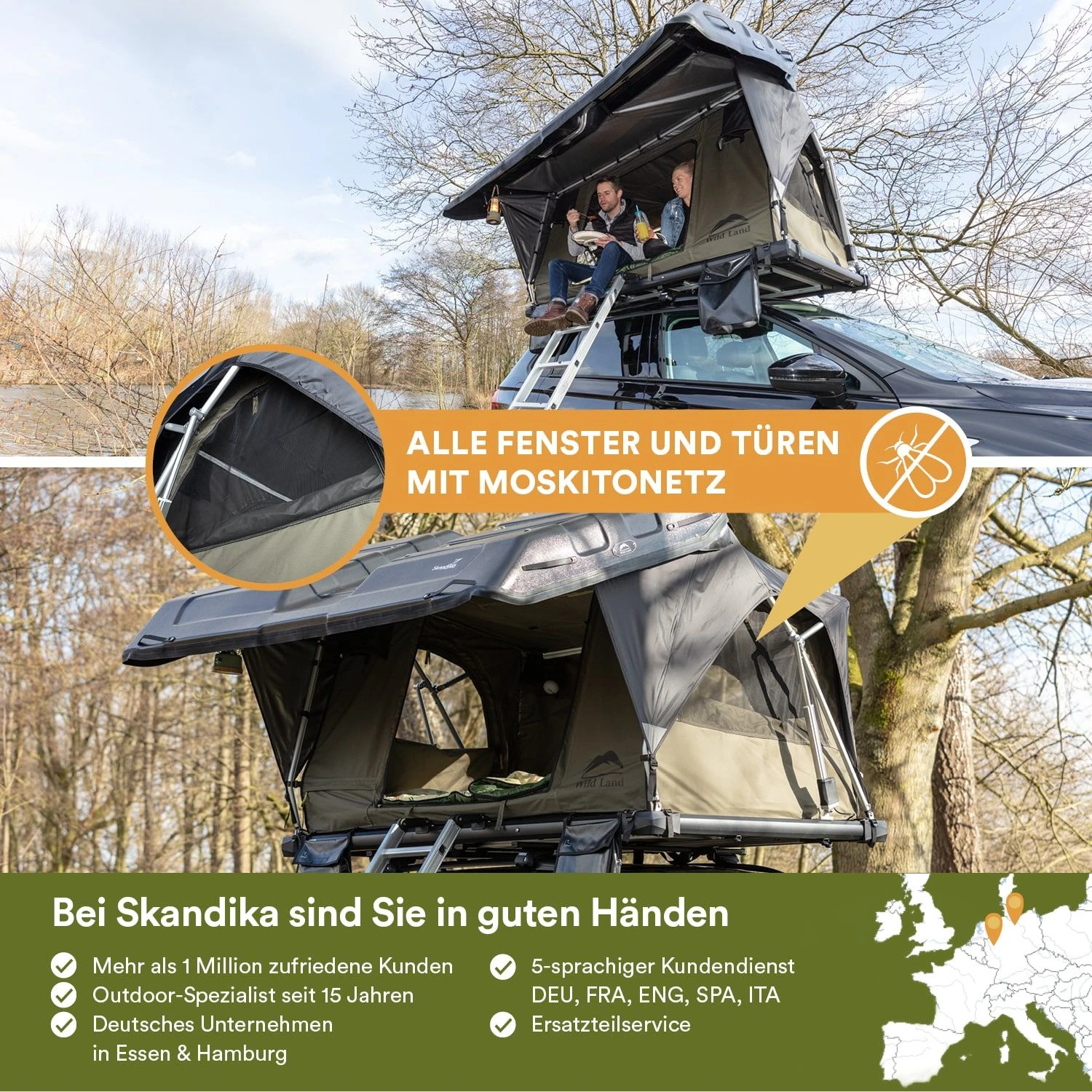 Das Skandika Wildland Dachzelt ist ein sorgfältig durchdachtes Konzept, das mit seinem schlichten Design sich überall sehen lassen kann, ob auf dem Campingplatz, draußen in der Natur oder einfach vor der Haustür. Es ist ein Komplettpaket auf kleinstem Raum, das erstaunlich viel Platz im Zelt und zusätzlich im Kofferraum für allerhand Sachen bietet, die das Abenteuererlebnis umso schöner machen: bequeme Stühle, Campingtisch, Grill, Gefrierbox, Dutch Oven, Outdoorspiele – auf der Skandika Webseite stehen zahlreiche Produkte zur Auswahl…!
